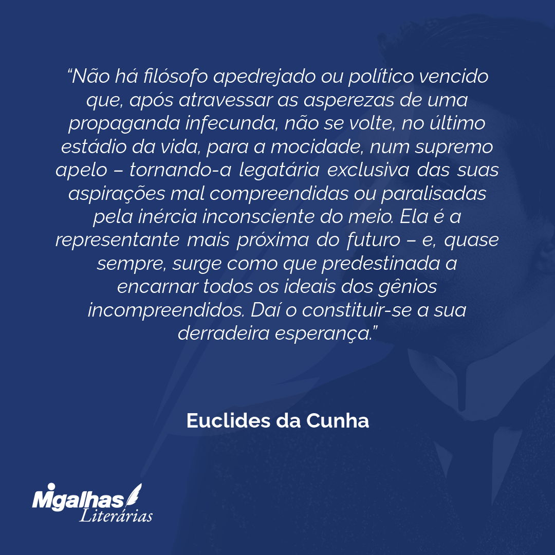 Não há filósofo apedrejado ou político vencido que, após atravessar as asperezas de uma propaganda infecunda, não se volte, no último estádio da vida, para a mocidade, num supremo apelo – tornando-a legatária exclusiva das suas aspirações mal compreendidas ou paralisadas pela inércia inconsciente do meio. Ela é a representante mais próxima do futuro – e, quase sempre, surge como que predestinada a encarnar todos os ideais dos gênios incompreendidos. Daí o constituir-se a sua derradeira esperança.