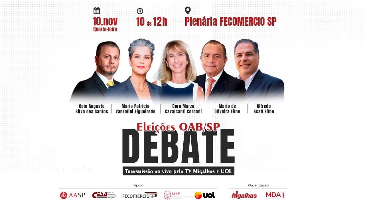 Migalhas, em parceria com o MDA - Movimento de Defesa da Advocacia, realizou nesta terça-feira, 10, debate com candidatos à presidência da OAB/SP. Participam do evento os candidatos Alfredo Scaff Filho,Caio Augusto Silva dos Santos, Dora Marzo Cavalcanti Cordani, Maria Patricia Vanzolini Figueiredo e Mario de Oliveira Filho.